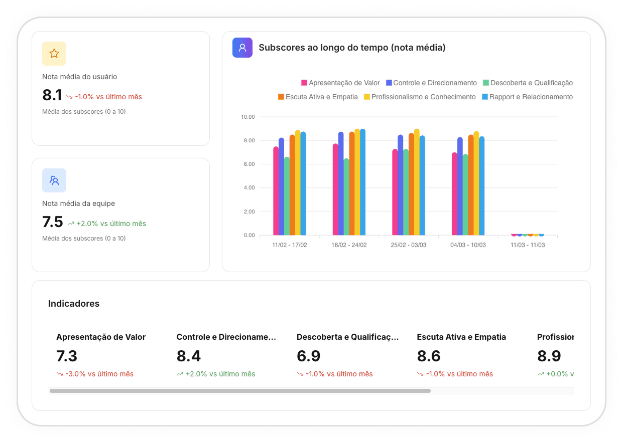 A IA atribui nota para cada reunião. Com isso você identifica rapidamente os usuários que precisam de treinamento e quem está performando bem.