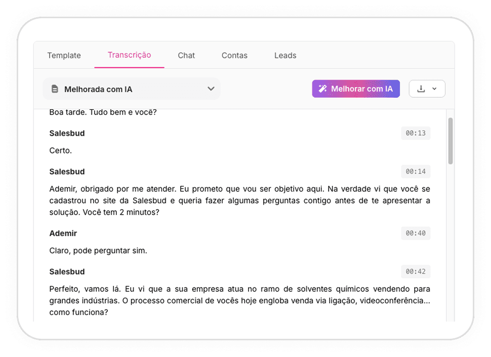 A Salesbud entende tudo o que foi conversado, resume e preenche o seu CRM, inclusive podendo preencher os cards de qualificação.